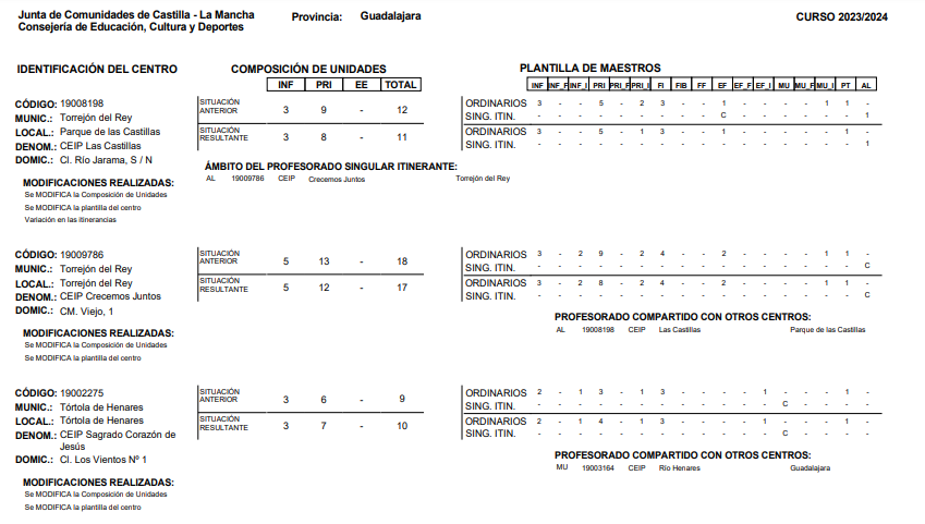 Por Orden 11/2023, de 18 de enero, de la Consejería de Educación, Cultura y Deportes de la Junta de Comunidades de Castilla-La Mancha (DOCM nº 18, de 26 de enero), se publica la plantilla, la composición de unidades y otros datos de determinados colegios públicos de educación infantil y primaria, colegios rurales agrupados y centros de educación especial.